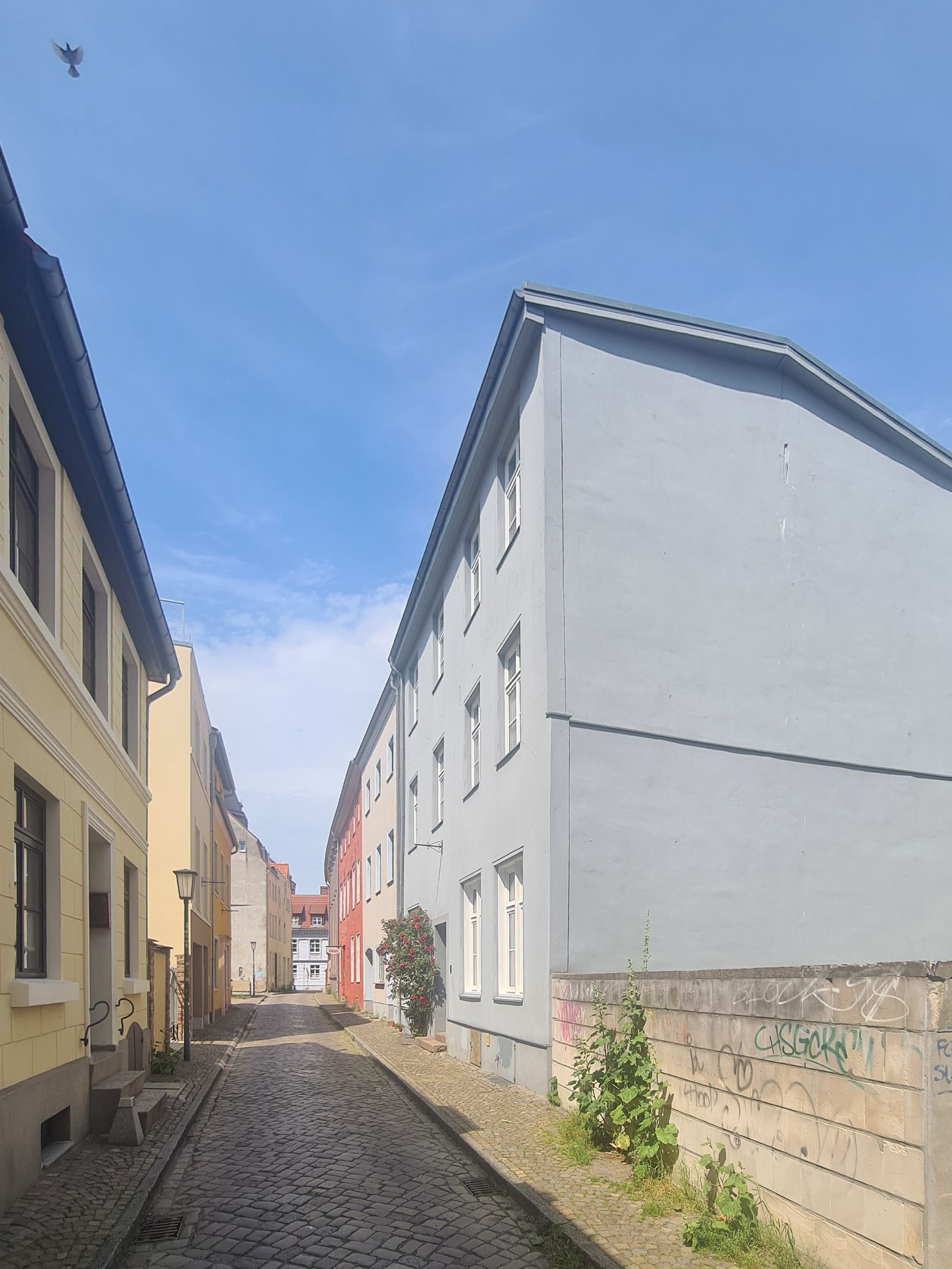 Die Haus liegt zentral auf der Stralsunder Altstadtinsel. Es befindet sich in einer kleinen Seitenstraße, die wenig befahren ist. Leute, die abends aus den umliegenden Lokalen kommen, hört man schon ab und an. Ansonsten sind links, rechts und gegenüber der Wohnung Wohnhäuser.
